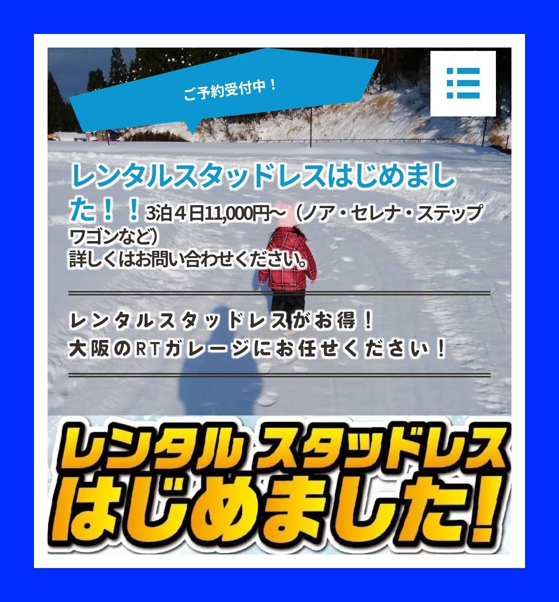 RTガレージでは、レンタルスタッドレスを3泊4日1台11,000円(税込み)~、作業時間30分~受付しております!